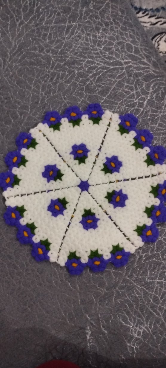 Yuvarlak, beyaz tabanlı ve mor-yeşil çiçek detaylı el örgüsü nihale. Altı parçaya ayrılmış ve her parça çiçeklerle süslenmiştir.