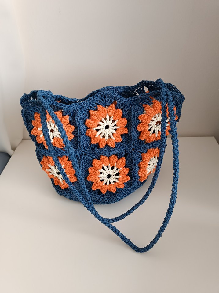Bohem tarzda, mavi örgü kumaş üzerine renkli çiçek desenleri işlenmiş kadın çantasıdır. Günlük kullanıma uygundur. #