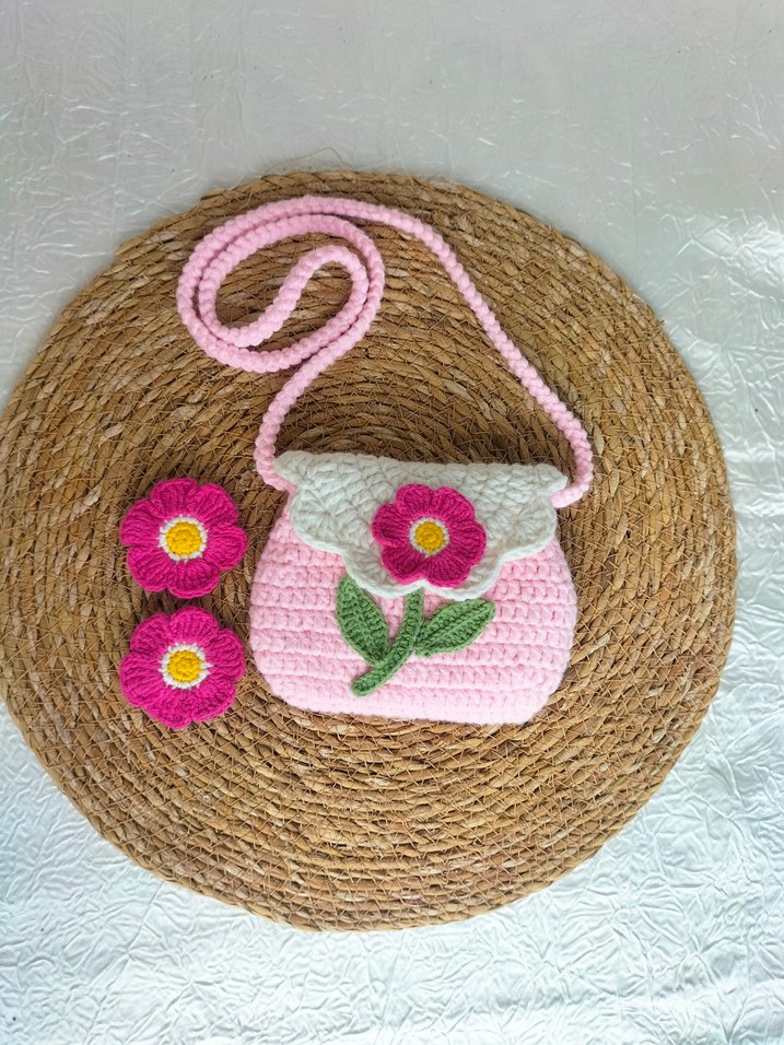 Pembe renkli örgü kız çantası, çiçek desenli ve uzun askılıdır. Bohem tarz için uygundur ve uyumlu çiçekli toka seti içerir.