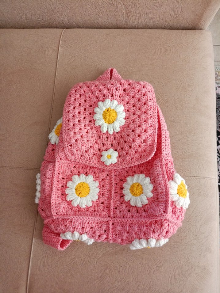 Pembe renkli, el emeği , çiçek desenli sırt çantası. sevimli tatlı bi çocuk çantası boy 26 cm en 24 cm dir cotton iplerle örülmüştür #alizecottongold #kartopu #yarnarts #elemeği #örgüçanta