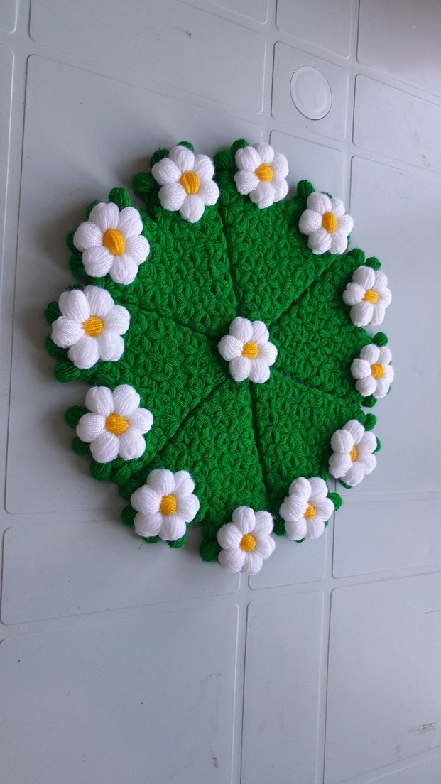 Beyaz ve sarı çiçek motifleriyle süslenmiş yeşil renk örgü bardak altlığı, geleneksel el işi tarzında.