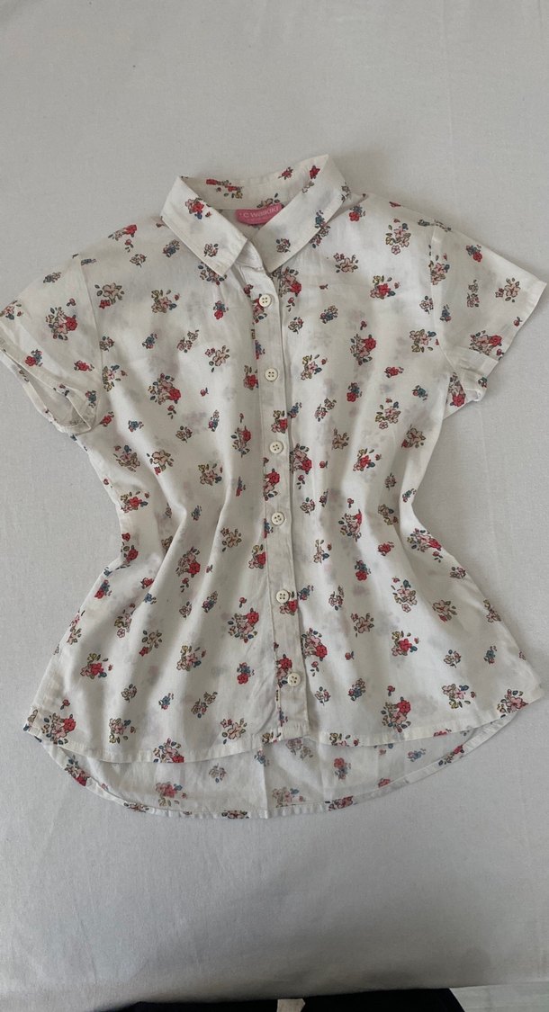 Pamuklu, kısa kollu, yakalı ve düğmeli beyaz gömlek. Çiçek desenli, bol kesim ve bohem tarzında, günlük kullanıma uygun.