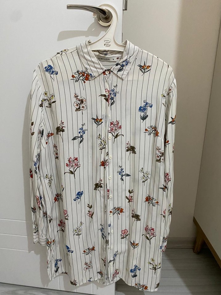 Pamuklu, uzun kollu, düğmeli, çiçek ve ince çizgili desenli beyaz gömlek. Salaş kesimiyle rahat bir kullanım sunar.