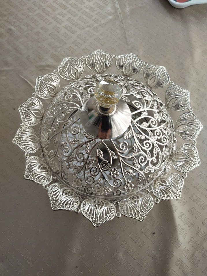 Parlak beyaz metalden yapılmış, çiçek desenli ve üzeri şeffaf bir top ile süslenmiş kapaklı tabaktır. Geleneksel tarzda, zarif detaylara sahiptir. ️