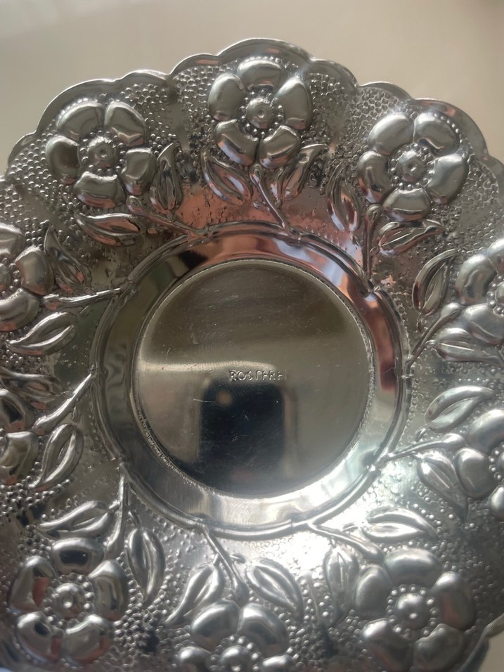 Parlak beyaz tabak, kenarında klasik çiçek desenleriyle süslenmiştir.