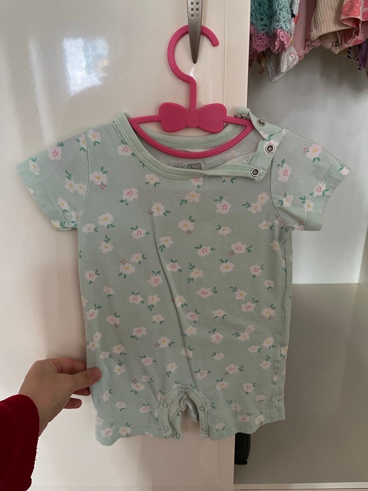 Pastel gri renkli, çiçek desenli yumuşak kumaştan yapılmış, düğmeli omuzlu bebek tulumu.