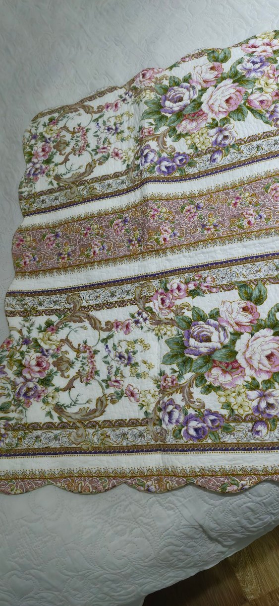 Çiçek desenli, pastel renklerde ve detaylı bordürlü yatak örtüsü. Yatak odasına zarif bir dokunuş katar. çift taraflı kullanılabilir