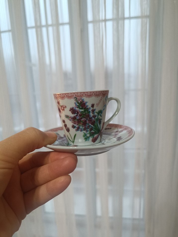 Beyaz porselen fincan ve tabağın üzerinde pastel renklerde çiçek desenleri bulunur, küçük kahve servisi için uygundur. ☕12 kişilik hiç bir sorunu yok