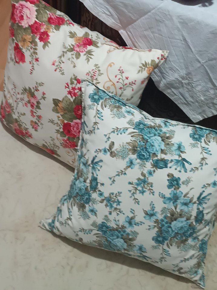 Yumuşak ve rahat kumaştan yapılmış, pastel renklerde çiçek desenli iki adet kırlent. Birinde pembe-yeşil, diğerinde mavi-bej çiçekler bulunur.