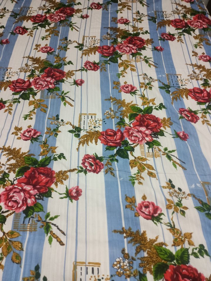 Pastel tonlarda çok renkli çiçek desenli, mavi çizgili yumuşak dokulu nevresim takımı.