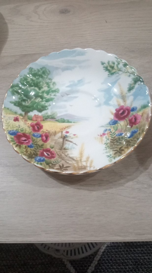 Pastel renklerde çok renkli çiçek desenli, kırsal manzaralı, klasik tarzda dalgalı kenarlı tabak. ROYAL ALBERT EŞLEME FİNCAN