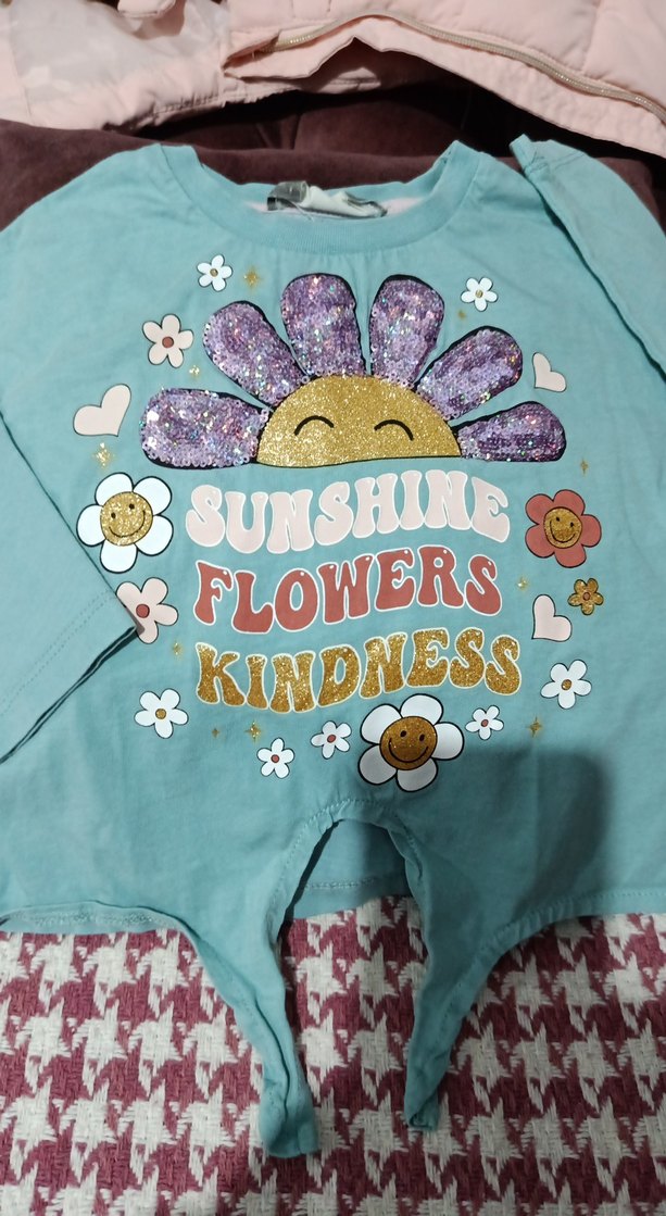 Çiçek ve yazı baskılı, payet detaylı, bol kesim, uzun kollu kız tişörtü. Sentetik kumaştan, pastel renklerde, straplez yakalı.