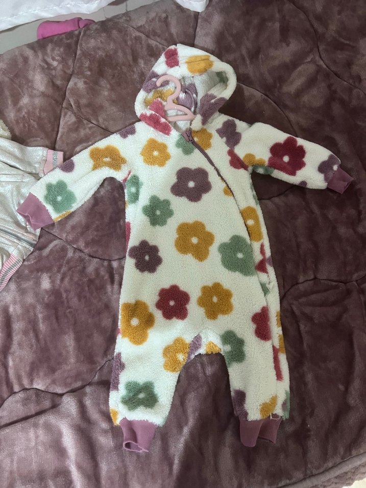 Pastel renklerde çiçek desenli, peluş kumaştan yapılmış kapüşonlu bebek tulumu.