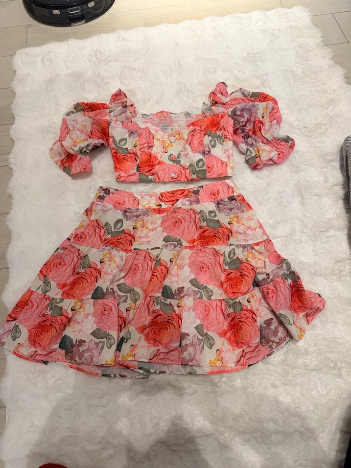 Kısa kollu, fırfırlı ve straplez yakalı, çiçek desenli, pembe renkl .