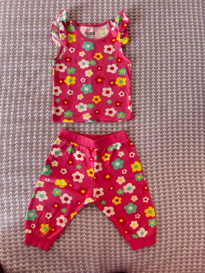 Kolsuz, renkli çiçek desenli ve fırfırlı bebek kız takımı. Üst ve uyumlu pantolondan oluşur. Renk fuşya. Marka e-bebek markalıdır.