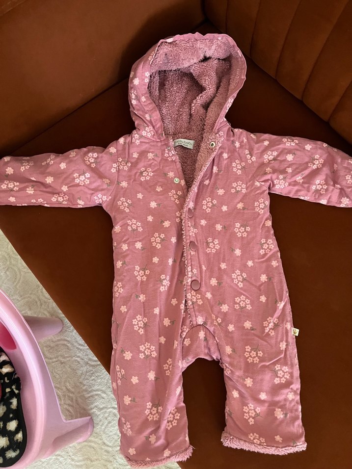 Pastel pembe renkli, çiçek desenli bebek tulumu. Düğmeli ve yaka kısmı notched lapel. İç kısmı yumuşak ve sıcak tutar. ❄️