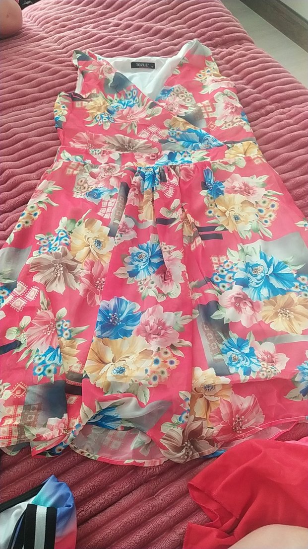 Renkli pembe elbise, salaş kesim, kolsuz ve V yaka, drapeli detaylarla parti için uygun.