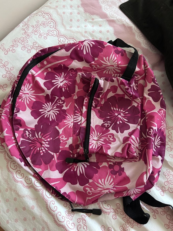 Renkli pembe çiçek desenli, fermuarlı cepli, sentetik kumaştan yapılmış kadın sırt çantası. Minik bir açılma vardır