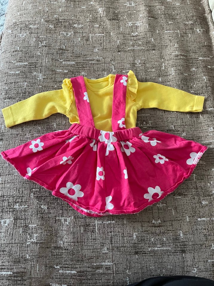Renkli pembe çiçek desenli askılı etek ve uzun kollu sarı, fırfırlı omuzlu üstten oluşan bol kesim kız çocuk elbisesi. Sentetik kumaş rahatlık sağlar.