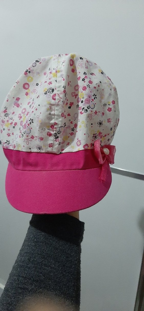 Sentetik kumaştan, çiçek desenli ve düğmeli fiyonk detaylı renkli pembe kız çocuk şapkası.