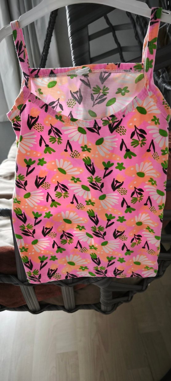 Renkli çiçek desenli, pembe renkte, straplez yakalı ve ince kesimli kız çocuk atlet. Yumuşak sentetik kumaştan yapılmıştır.