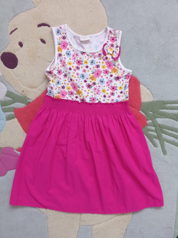 Çiçek desenli üst kısmı ve canlı pembe eteği olan kolsuz kız elbisesi. Bol kesim, fırfır detaylar ve askısız yaka ile bohem tarzda. hiç bir sorunu yok