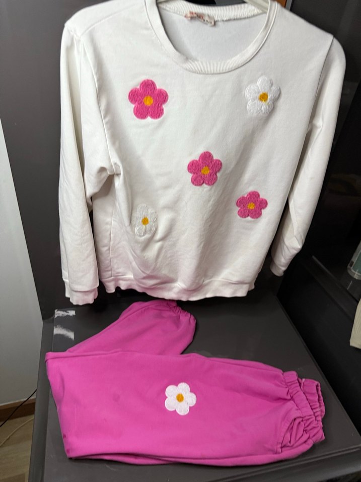 Uzun kollu, yuvarlak yaka sweatshirt ve lastikli pembe eşofman altından oluşan, çiçek desenli dantelli kız eşofman takımı. Yumuşak ve sıcak kumaştan, rahat kesim. biraz leke tutmuş güzelce yıkayınca gider
