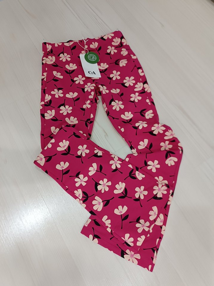 Renkli çiçek desenli, elastik bel bantlı, yumuşak sentetik kumaştan yapılmış pembe, fitted kız tayt. Bohem ve retro sokak stiline uygun.