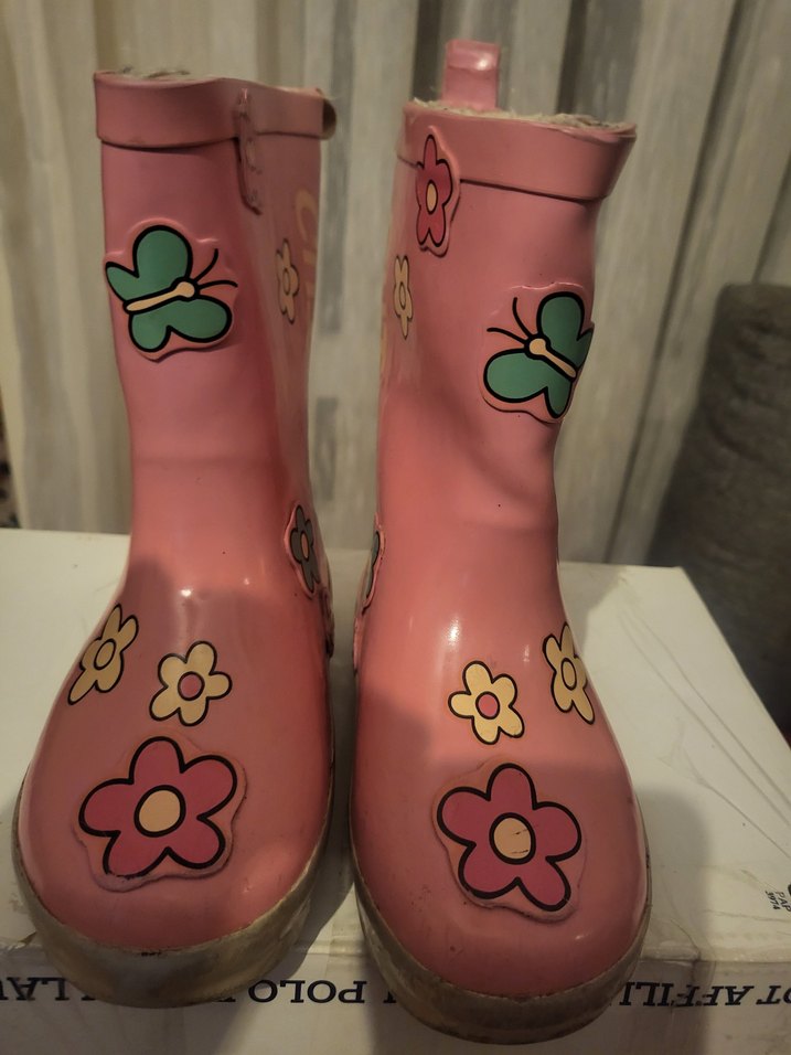 Çiçek ve kelebek desenli, tokalı pembe kız yağmur çizmesi. Pastel renkleriyle retro, bohem tarzı yansıtıyor.