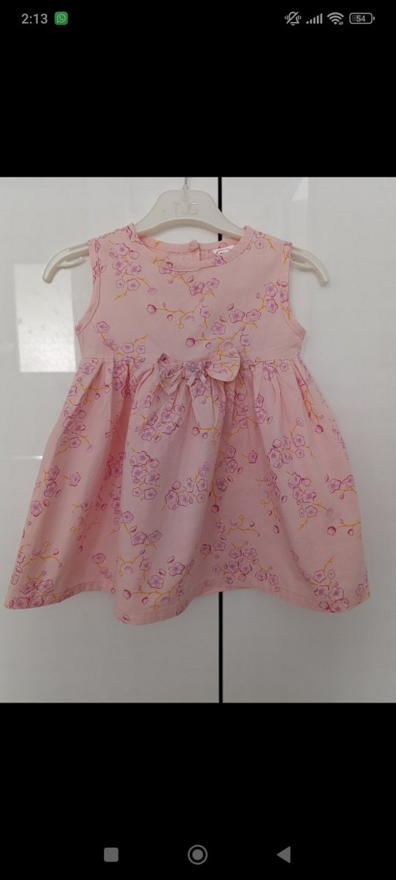 Pembe, kolsuz, çiçek desenli ve fırfırlı, bol kesim kız elbisesi. Yumuşak sentetik kumaştan üretilmiştir. 1 kez kullanıldı