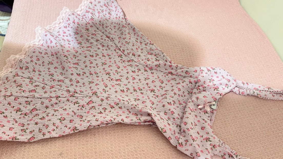 Çiçek desenli, pembe pastel renkte, tekne yakalı ve askılı kollu, vücuda oturan mini elbise . Tam bir Pinterest elbisesi
