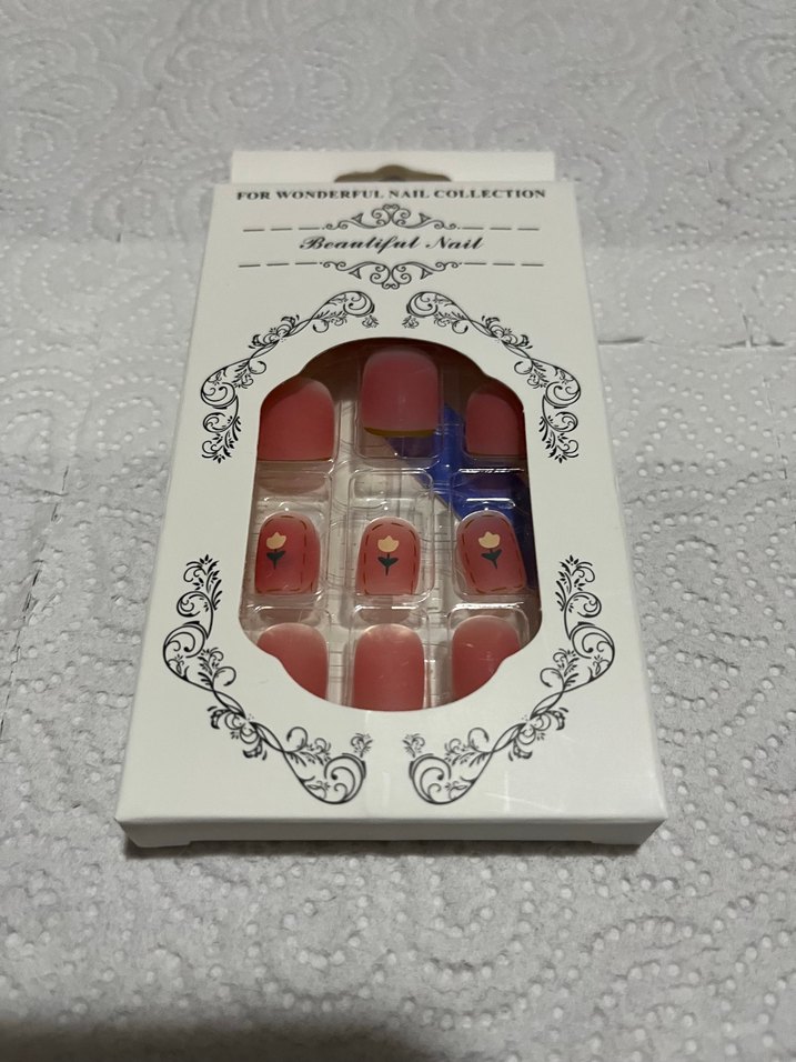 Beyaz kutuda, çiçek desenli açık pembe takma tırnak seti. 24 adet tırnak 24 adet yapıştırıcı bir adet törpü