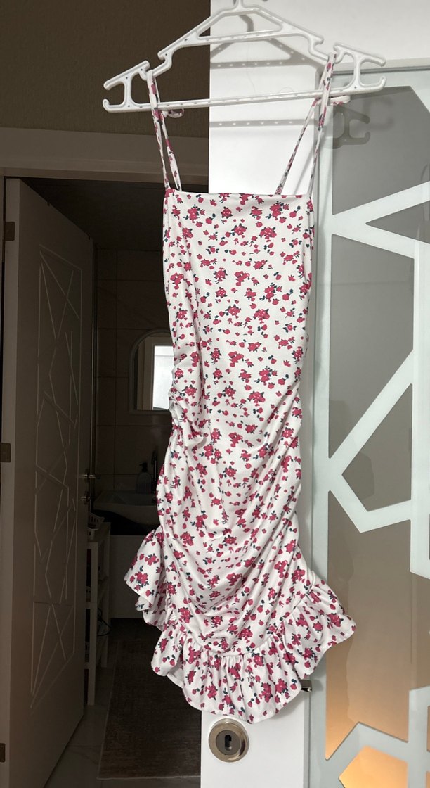Hafif pembe çiçek desenli, askılı ve straplez uzun mini elbise, drapeli ve fırfırlı etek ucu ile yumuşak sentetik kumaştan üretilmiştir. Romantik buluşmalar için uygundur. 1 kere giyildi