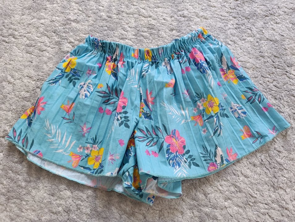 Sentetik kumaştan, pileli ve pastel çiçek desenli bol kesim kız şortu, bohem tarzını yansıtıyor.