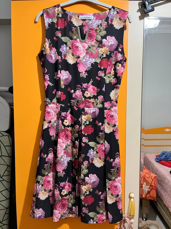 Kolsuz, v yaka, pileli detaylı, çiçek desenli ve renkli midi boy oturan elbise. Sadece iki kere giyildi, yandan fermuarlıdır. Oldukça rahat içinde astarı olan bir elbise.
