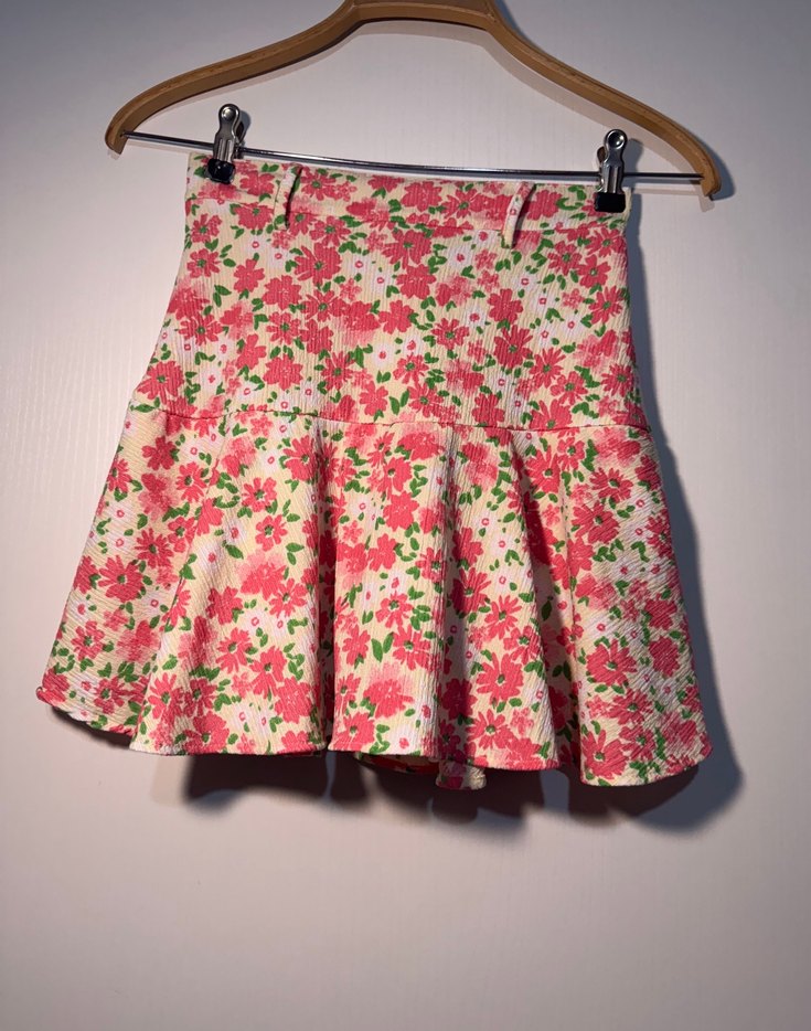 Renkli çiçek desenli, pileli ve ince yapılı şortlu mini etek, bohem tarz için uygun, yumuşak sentetik kumaştan yapılmıştır. İki ayrı etek takım