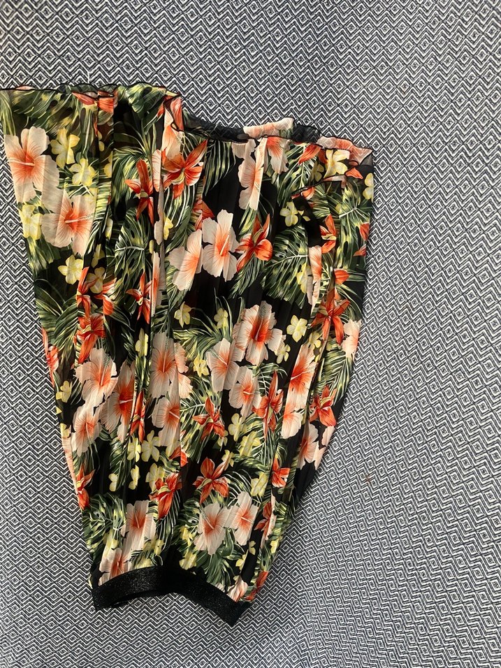 Sentetik kumaştan, pilili ve bol kesim, koyu renkli çiçek desenli bohem kadın etek