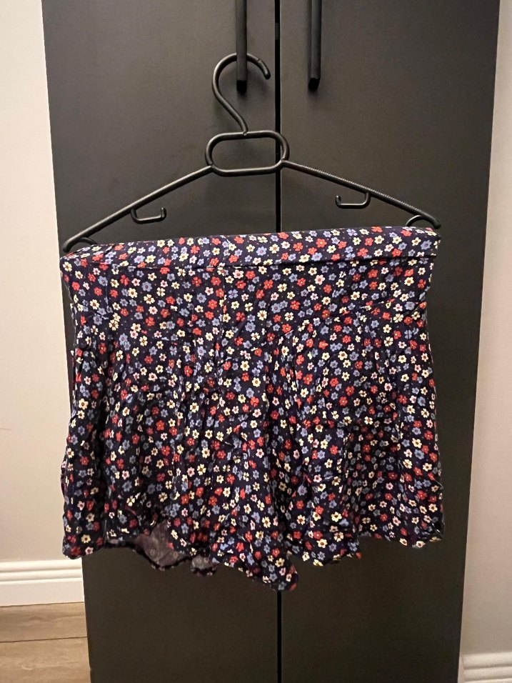 Pamuk kumaştan yapılmış, pilili ve bol kesimli, koyu renk çok renkli çiçek desenli mini etek. 32 34 beden. şortlu. 2 kere giyildi.