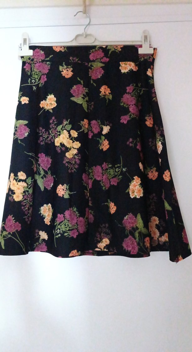 Yumuşak kumaştan, piliseli ve bol kesimli, koyu renkli çiçek desenli hamile eteği. Vintage bohem tarzında, midi boyda, günlük kullanıma uygun. boy 57 cm