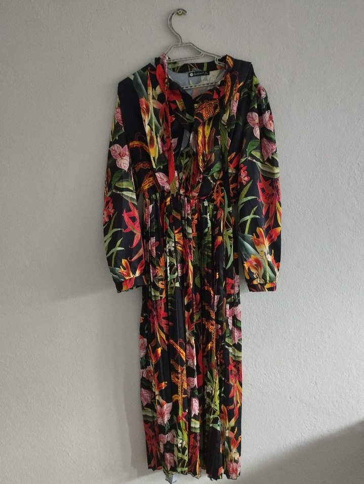 uzun elbise ister tesettür ister normal zamanda giyilebilir yada abiye olarak da olabilir düğmeli onu bağlamalı s yada m beden 1 kez giyildi