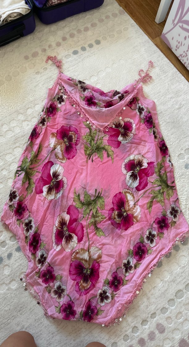 Çiçek desenli, askılı ve dökümlü yakalı, bol kesim plaj elbisesi
