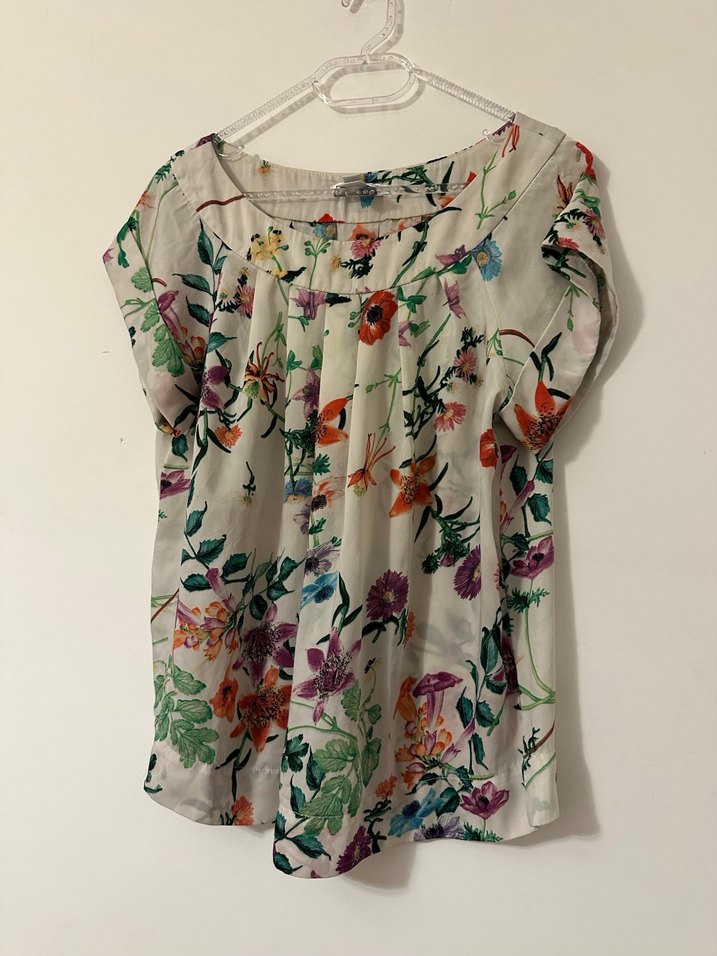 Kısa kollu, tekne yaka ve bol kesim kadın bluz. Yumuşak dokulu, açık renkli çok renkli çiçek desenli ve pliseli detaylara sahip, bohem tarzda günlük kullanım için uygundur.