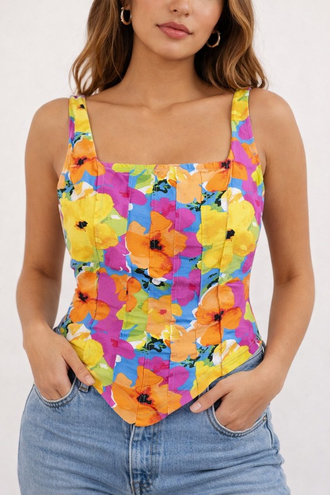 Renkli pastel çiçek desenli vücuda oturan pop art tarzı büstiyer. Rahat sentetik kumaştan, günlük kombinlere uygun.