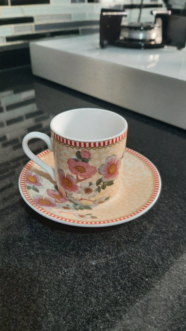 Porselen fincan ve tabağı, pastel çiçek desenli, pembe çiçekler ve bej zeminle kırmızı çizgili kenarlığa sahip. Fincanın içi beyaz ve kulplu.