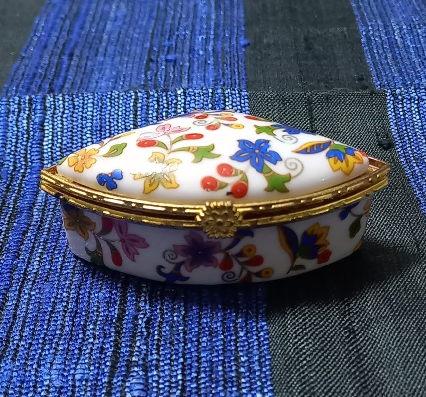 Çiçek desenli, porselen retro takı kutusu eni 7cm. yüksekliği 3cm. kapak açma kapama kilit bölümü metaldir plastik değil