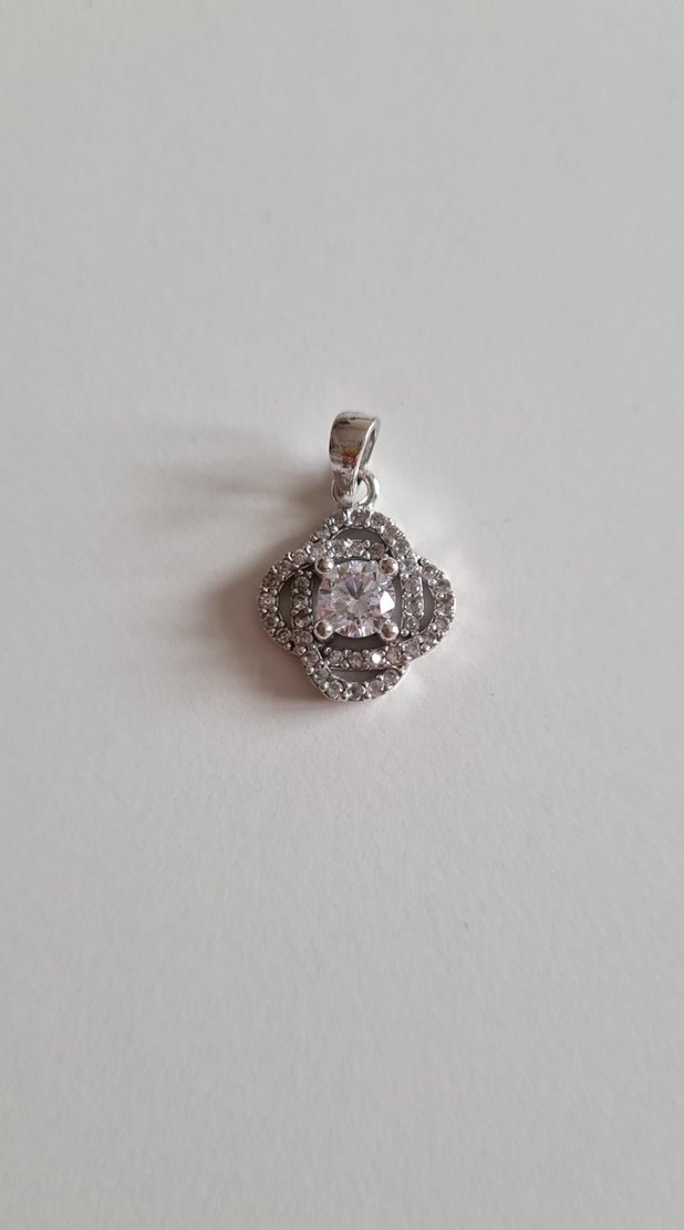 Bu kadın kolye ucu, çiçek desenli ve pullu detaylara sahip olup beyaz ve gri tonlarda modern klasik ve vintage şıklığı bir araya getirir. Düğünler için uygundur.