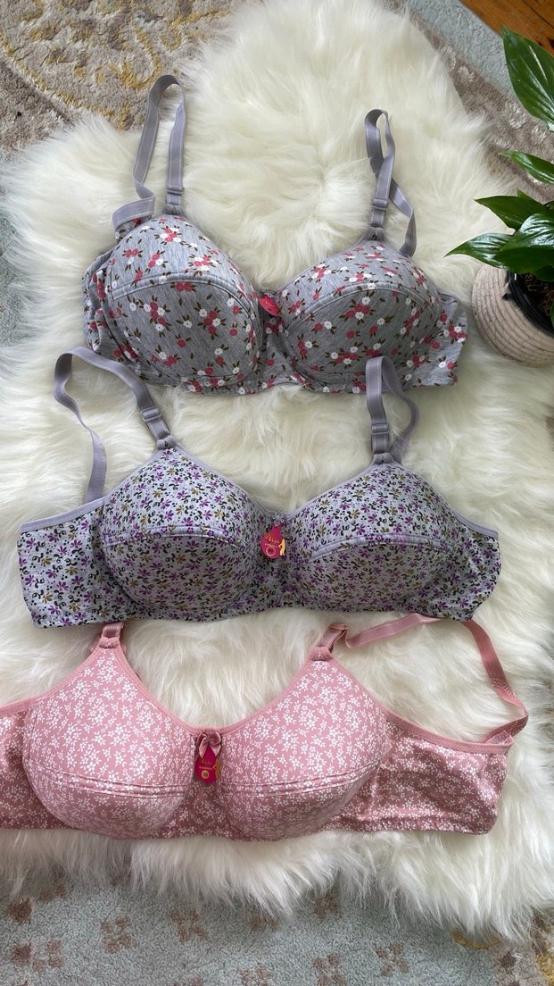 Pembe ve gri tonlarda, çiçek desenli, bohem tarzda ve normal uzunlukta üç rahat sütyen. Desteksiz