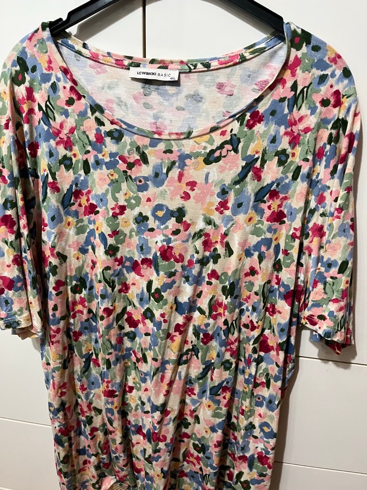 Bol kesim, kısa kollu, drapeli, pastel çiçek desenli hamile tişörtü. Yuvarlak yaka ve midi boyda, günlük rahat kullanım için uygun.