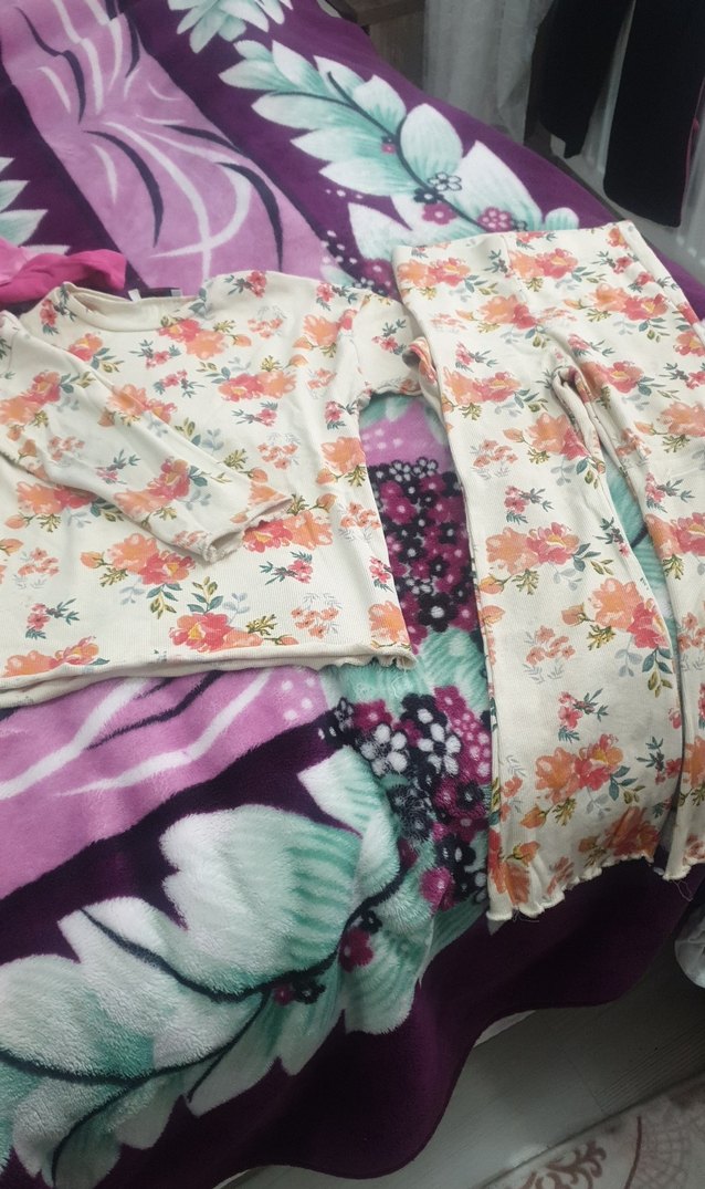 çiçek desenli takım., pastel tonlarda ve bohem tarzda.