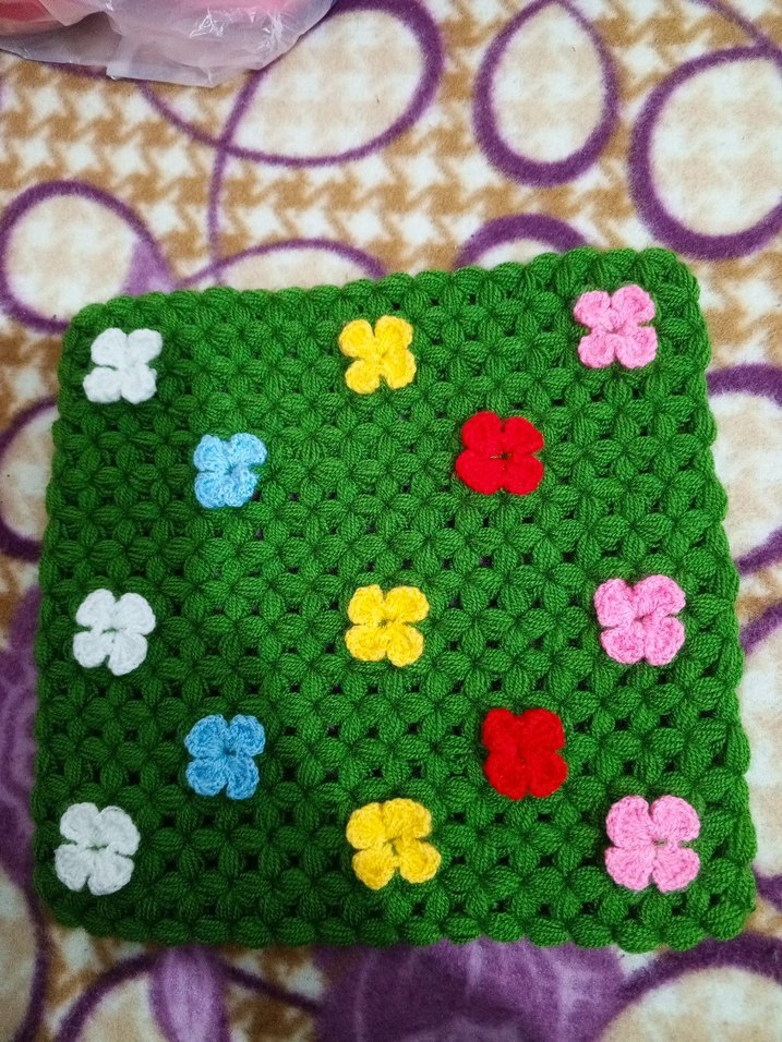 Yeşil tabanlı, çeşitli renklerde küçük çiçek desenleri bulunan renkli banyo lifi.